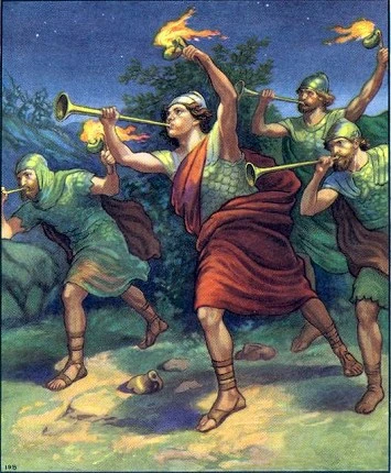Gideon was a judge of the Israelites, whose career is summarized in Judges 7-9. During his life, Israel was under constant attack by the Midianites and Amalekites, and its people had turned to the worship of the false god Baal. With an army of only 300 men, each carrying a shofar horn, there could be no doubt that victory had come through God's favor. Fear and discord were sown in the Midianite camp by the sound of 300 shofars, causing the Midianites to panic and kill one another. Gideon's men went on to win the war decisively.