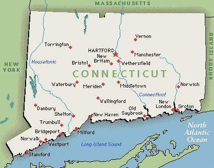 Connecticut is a state in the New England region of the northeastern United States. It is bordered by Rhode Island to the east, Massachusetts to the north, New York to the west and south (because various islands of New York span Connecticut's entire coast), and the Atlantic Ocean to the south. The capital of the state is Hartford while the largest city is Bridgeport. Southwestern Connecticut is part of the New York City metropolitan area; three of Connecticut's eight counties, including most of the state's population, are in the New York City combined statistical area, commonly called the Tri-State Region.