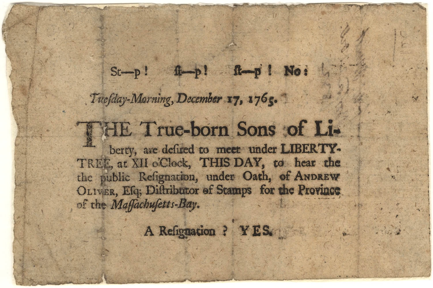 A Sons of Liberty bulletin from 1765.